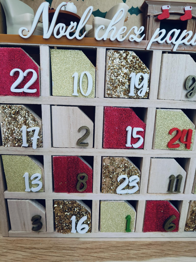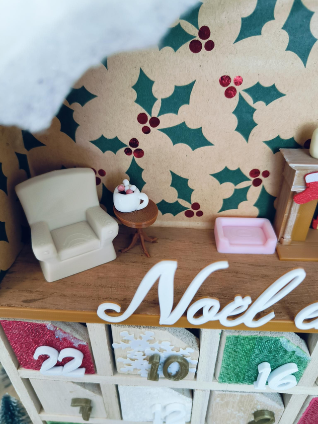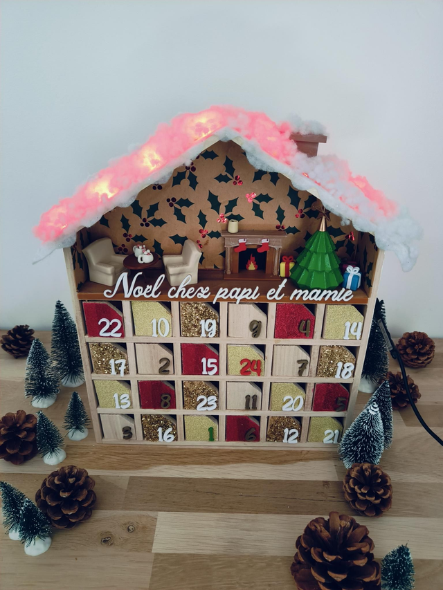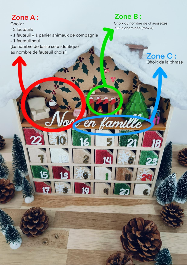 Tu peux choisir ta couleur : rouge et or ou rouge et vert, mais aussi le nombre de fauteuils, le nombre de chaussettes présentes sur la cheminée et personnaliser la phrase présente sur le calendrier !